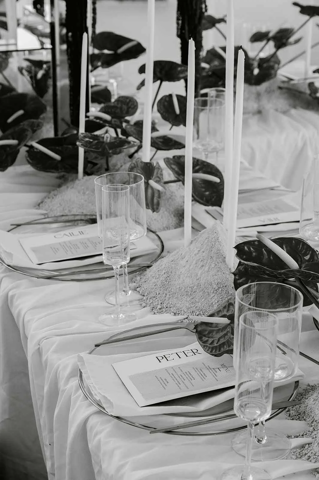 A daring red and white palette carried through the suite, from lipstick-marked vellum accents to cotton menus layered with soft red tulle. Every element whispered modern allure and confident sophistication, a love letter to passion, wrapped in couture-level detail.