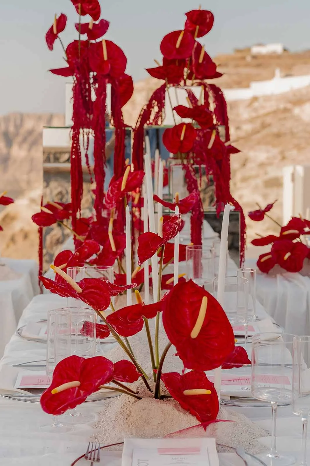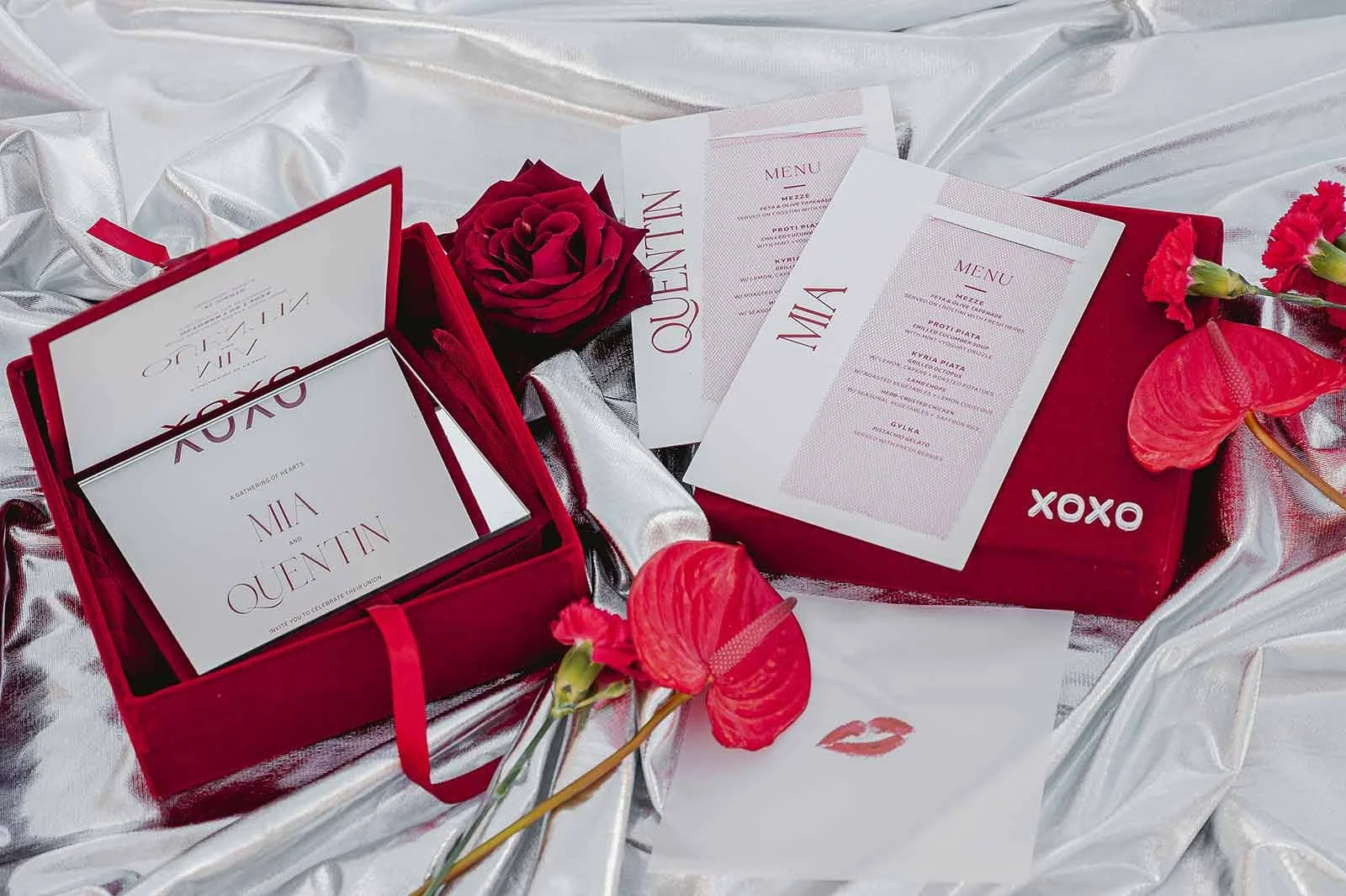 Set against the iconic whitewashed backdrop of Santorini, this styled shoot embraced bold romance and unapologetic luxury. The centerpiece: a fully custom red velvet invitation box featuring an interactive mirrored design, a modern play on reflection where the message revealed itself only through the mirror’s gaze.